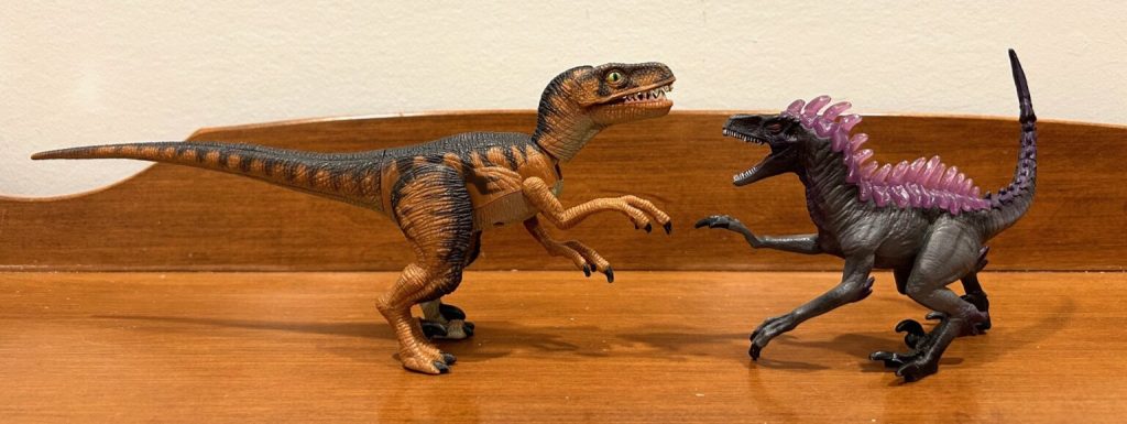 Skiaraptor is distinctive in a number of ways from other dromaeosaurs, ways that are nicely reflected on this toy. For starters, it did not possess any feathers on its body. Perfectly preserved skin impressions have shown that it was covered in serpent-like scales and wrinkles instead, which is reflected on this toy. It also possessed two sharp, curved spurs on each of its elbows and ankles, which were presumably used in combat. And indeed, a trio of claw marks on this individual’s right thigh testifies to its violent lifestyle. Skiaraptor also boasted pronated wrists, meaning it could rotate its hands just like a primate’s. Repeated testing on both the foreclaws and hind claws have concluded that they were strong enough to cut through steel.