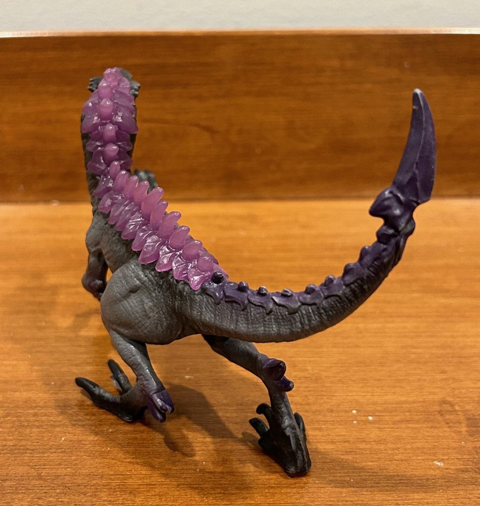 The Skiaraptor‘s main colour is dark grey with darker patches on its head and limbs. Dark purple is applied to the throat, the spikes on the elbows and heels, and the top and tip of the tail. The claws are black, the eyes are red, the inside of the mouth is maroon, and the teeth are white. Finally, the spikes running down the back of the neck and torso are translucent purple. A most decidedly sinister colour scheme indeed.