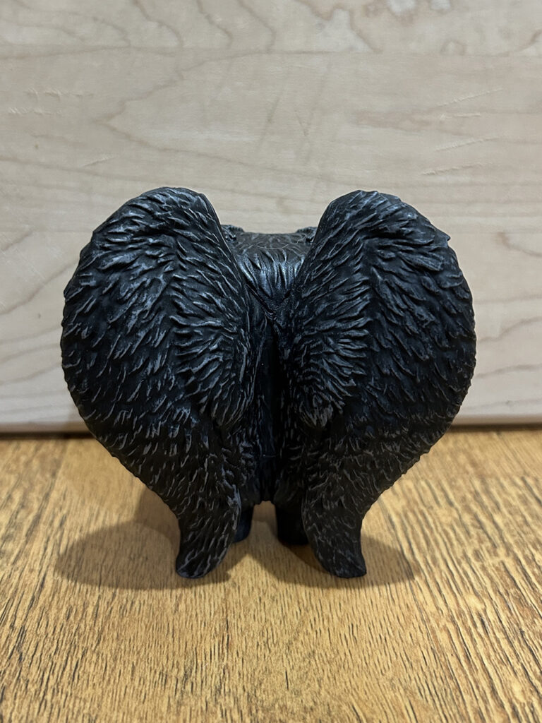 That’s fine with me though, because the design is right up my alley. It takes the hunched look of typical Mothman depictions and turns it into a simplified, almost adorable creature. Its body is shaped somewhat like an upside-down egg, covered in sculpted black fur. It has very few features other than its large, imposing eyes and two feathery antennae, the only real nod to the moth aspect of the creature. Two large, furry wings envelope the figure’s form like elephant ears. Its legs are short and stumpy with clawed feet, and its tiny arms are held close to its body in a way that, to me, gives this Mothman an almost pensive demeanor.