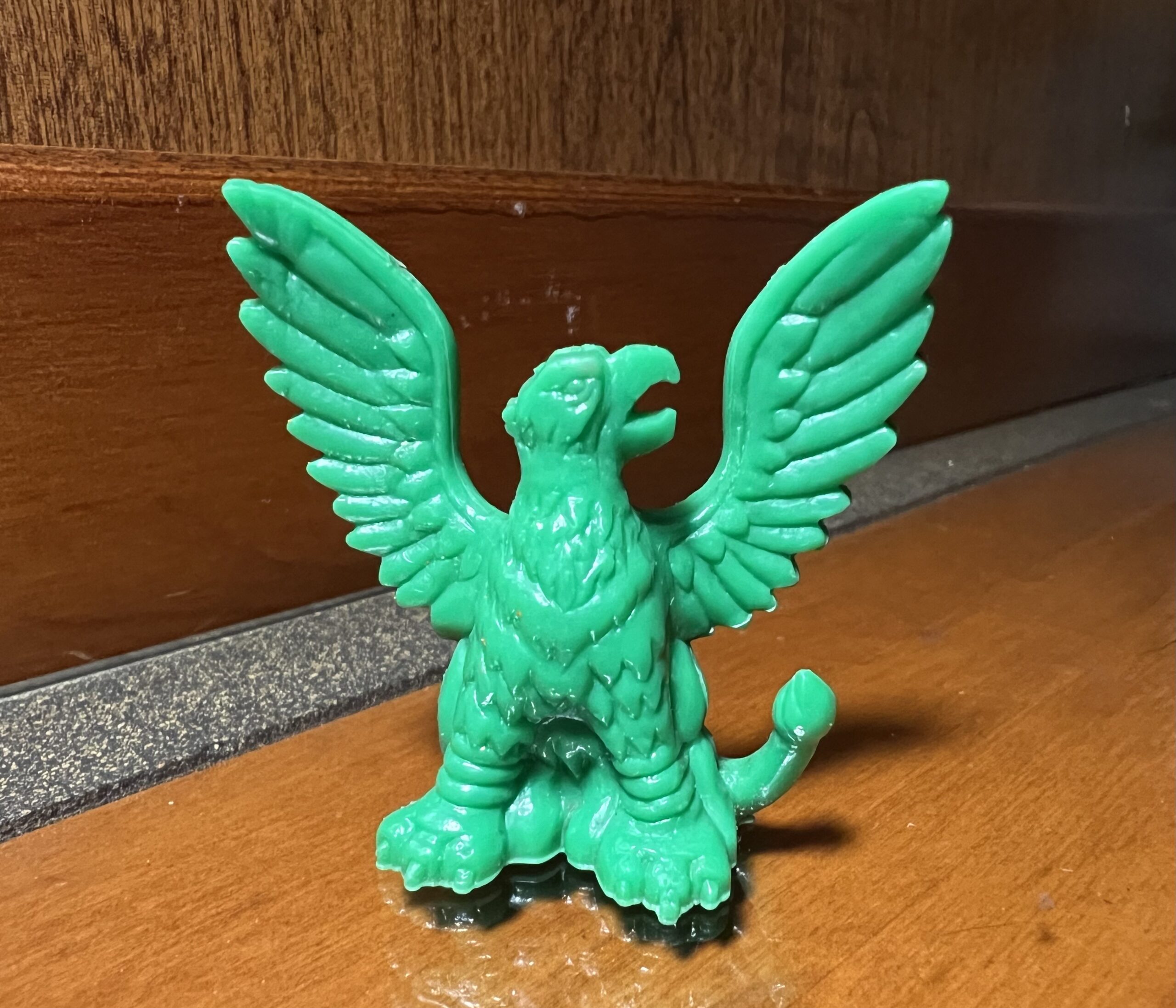 The Monster in my Pocket Griffin is in a sitting pose with its wings majestically raised and its head turned to the side. You almost cannot see the lion half viewing the front of the figure except for the lion tail that’s curling out to the side. It is one of the less heavily detailed of the earlier Monster in my Pocket figures, with simple textures implying feathers on the head, neck, and upper arms. The wrists have this segmented pattern to them, which was extremely common for lots of bird legs portrayed in media during the 80s and 90s I feel. (Bigbird from Sesame Street’s legs are a clear example of this if you need an example of what I mean.)