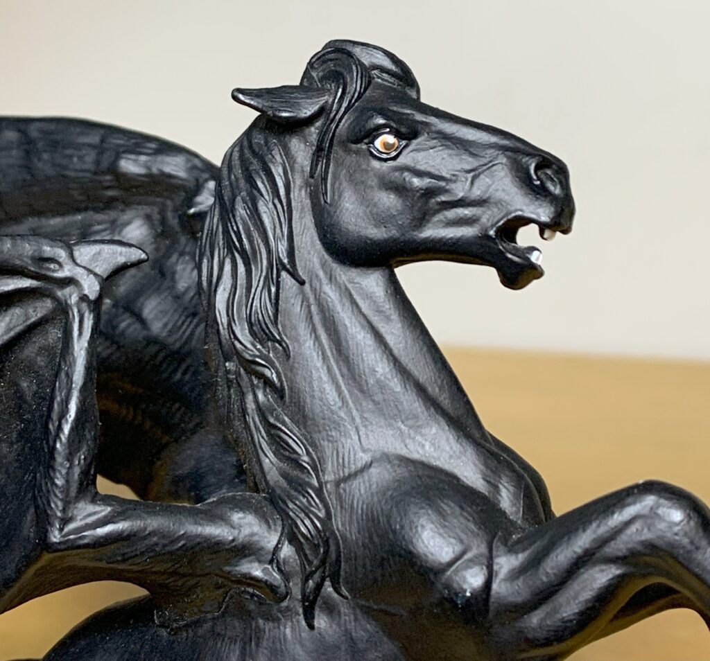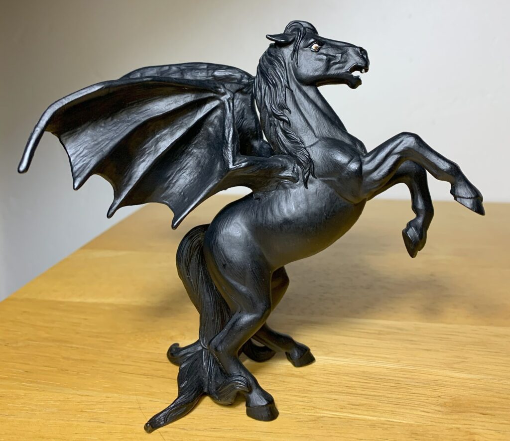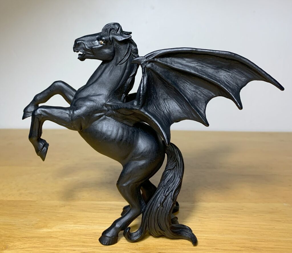 Safari’s Areion figure is more of a dark twist on Pegasus, also from Greek mythology, than it is a representation of Areion. Everyone is familiar with Pegasus, who has bird wings and is typically white. Like Areion, Pegasus was also fathered by Poseidon, but his mother was Medusa. Weird, I know. Although I don’t have one, I imagine that this Areion would display well with a Pegasus figure. And although Areion is out of production he can still be found online for close to retail price, for the time being.