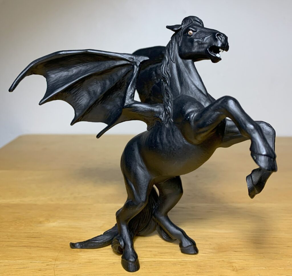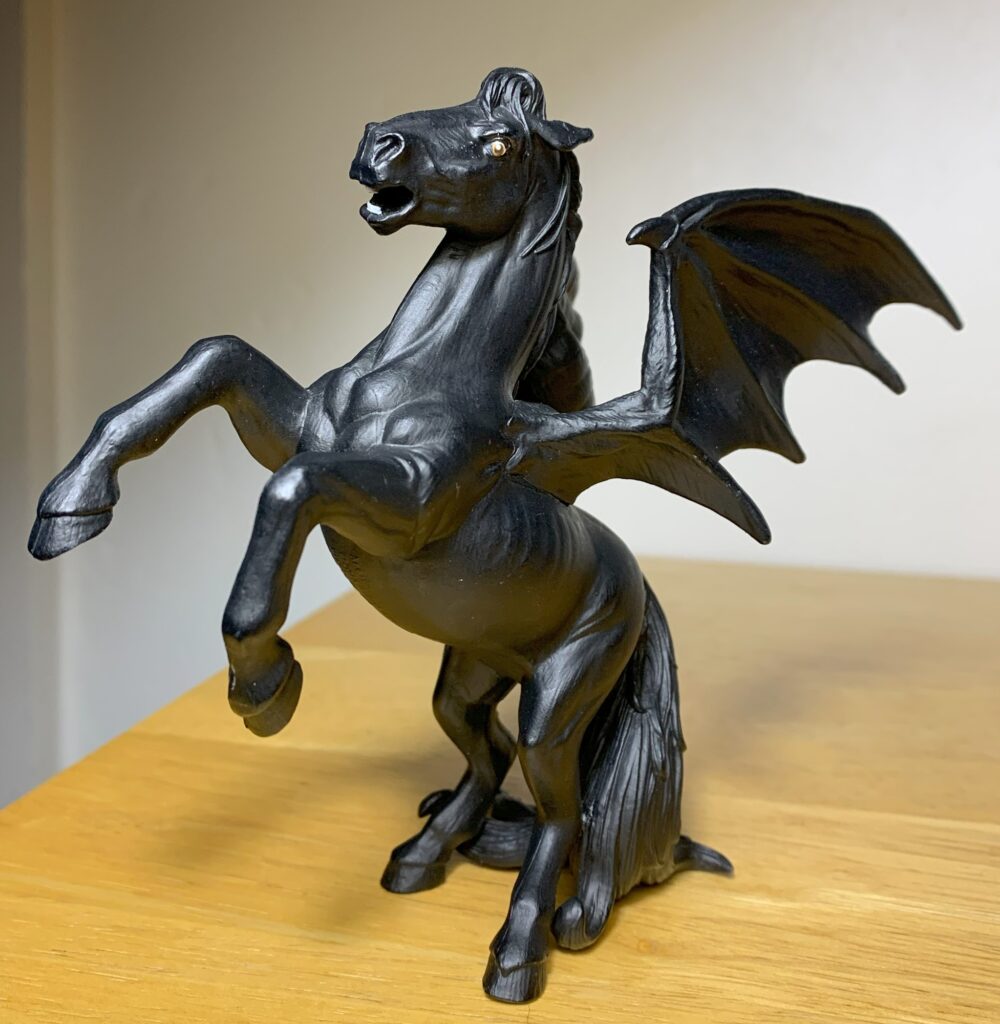 Today we’re looking at the Safari Ltd. figure of this mythical horse, produced in 2013 and now retired. Although no descriptions or illustrations of Areion show him with a set of bat wings, they’re included here. I suppose without them it would just be a regular horse toy, so Safari’s artistic license is appreciated. Strangely, there do not appear to be any bat-winged horses in mythology and folklore, but they have been included in some modern works of fiction.