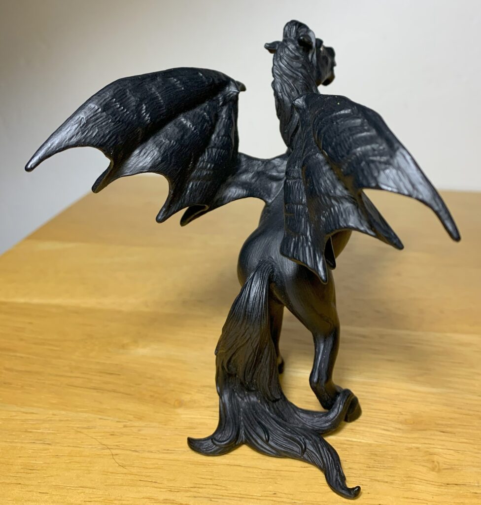 Safari’s Areion figure is presented in a threating display, reared up on his hindlegs with his forelimbs swinging wildly in front of him. He stands with the aid of his luscious tail. Areion’s paintjob is simply and effective, he’s entirely black as night. It gives him a very statuesque and grand demeanor. His mouth is open and the only color on him that isn’t black are his white teeth and piercing eyes, which are white with brown irises, black pupils, and spots of white eyeshine. He stands 5.25” (13.34 cm) tall.
