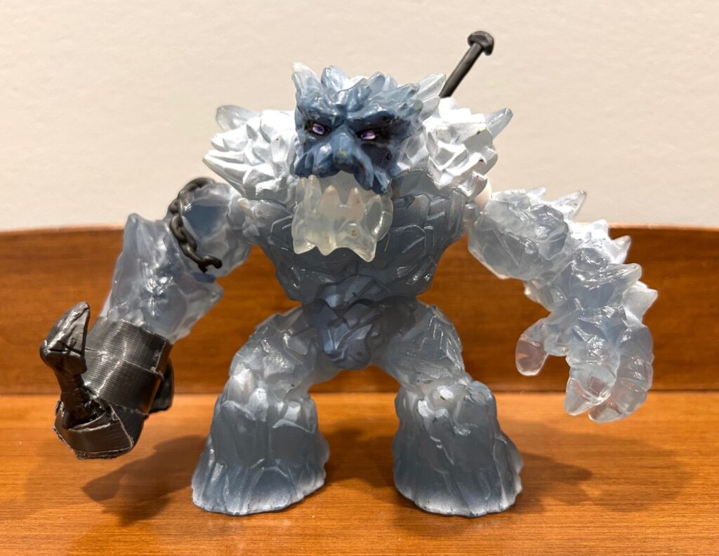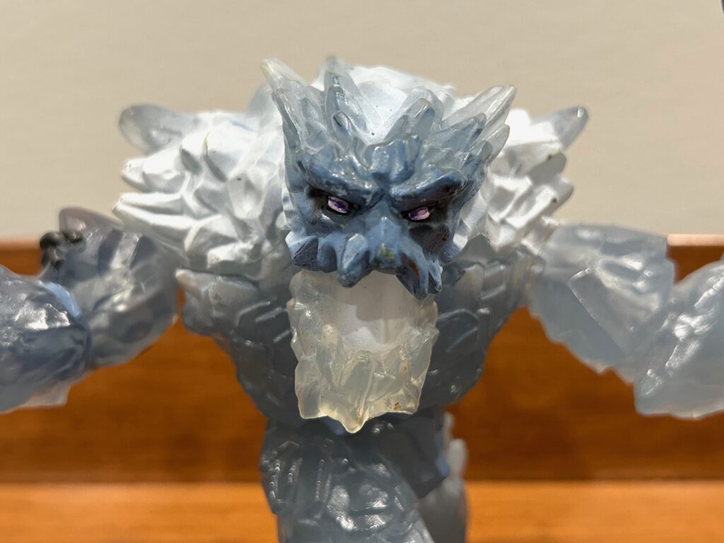 The ice giant’s mouth is huge and lined with sharp teeth, and his hinged lower jaw opens to about 30 degrees. He can either freeze you with his breath, crunch you into bits, or do both. He also has a 360 degree rotating torso and ball joints at the shoulders.