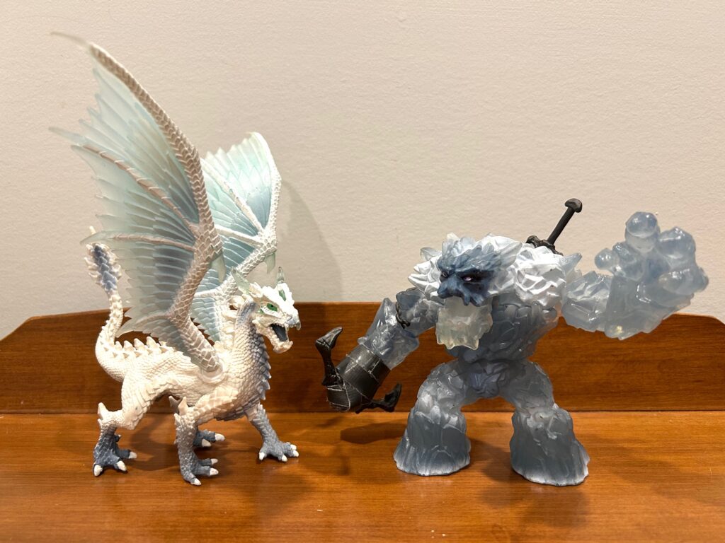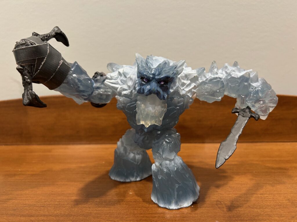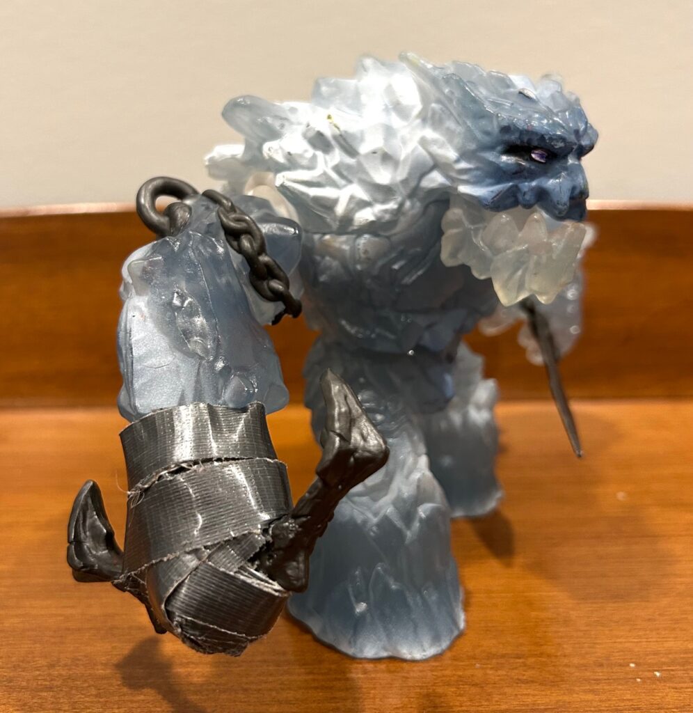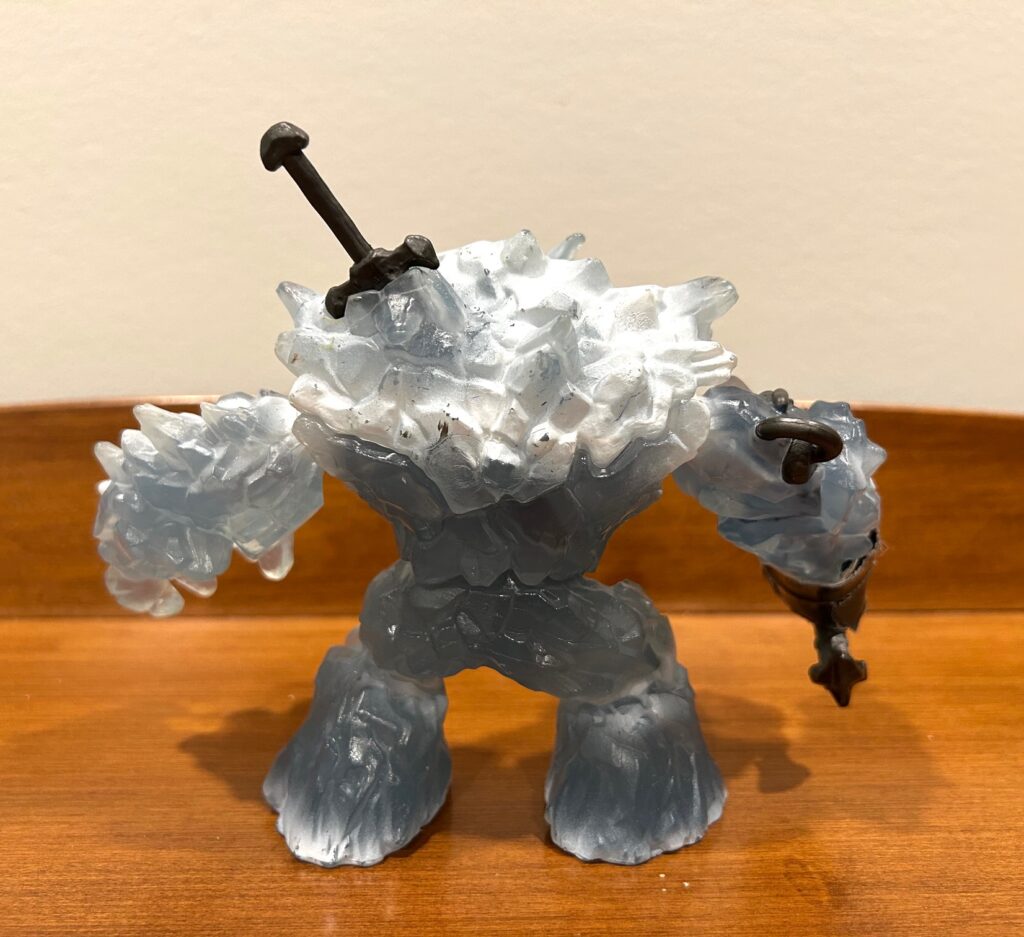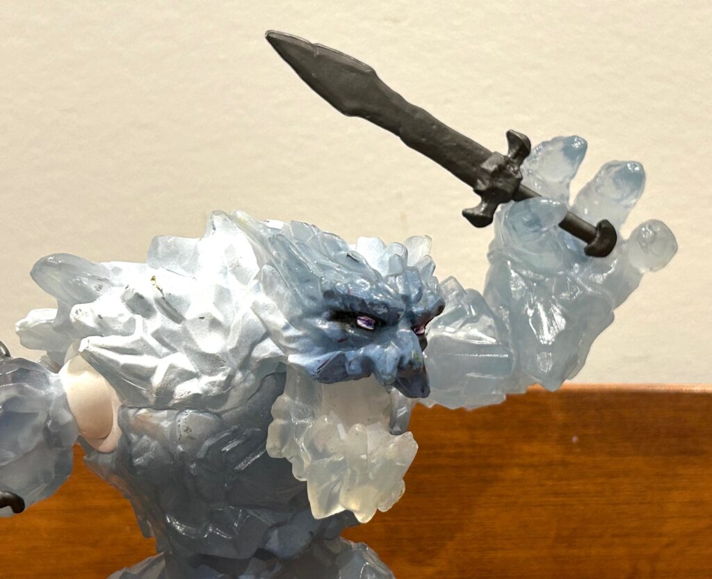 However . . . you’ve undoubtedly noticed the ample duct tape wrapped around the anchor. Well, when I first got this toy for my older son, the head of the anchor broke clean off after a mere fall from the coffee table on the very same day. Needless to say, we were both quite disappointed. I expressed as much in a short review on Schleich’s website and I was then contacted by a representative asking for my mailing address. Lo and behold, they sent us a replacement ice giant for free, which was very kind and generous of them indeed. And since I certainly didn’t want the same breakage to occur again, I applied the duct tape. And it has worked great for years now. Naturally, the anchor head can no longer rotate, but none of us mind. As you can see from all the scuffs, this ice giant has fought in many savage battles and taken many falls without serious issue.